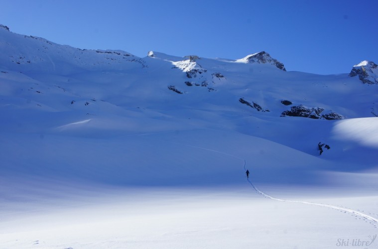 Nous avons vécu une journée extraordinaire dans le Val de Rhèmes. La montée fut certes longue, notamment avec ce long faux plat pour rejoindre le glacier du Fond oriental, très bien bouché. Celui-ci nous fit enfin prendre du dénivelé de façon très efficace. Tout au long de la montée, la neige devenait de plus en plus légère, restée bien froide dans cette belle journée ensoleillée. Une fois le sommet atteint, nous nous sommes rendus sous la Punta Bousson, après une courte traversée NE, pour atteindre le haut du Glacier de Lavassey. Nous avons skié une pente un peu plus soutenue dans une neige de cinéma. La descente fut majestueuse jusqu’au bas du glacier du Lavassey pour rejoindre le replat. Une journée extra en montagne comme on les aime. |
