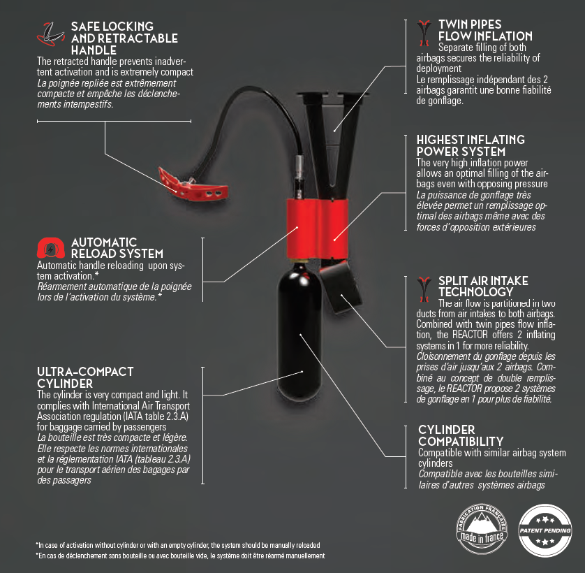 Une autre particularité sur laquelle l’équipe de développement a longuement réfléchi concerne le cloisonnement du gonflage depuis les prises d’air jusqu’aux deux airbags. En effet, combiné au concept de double remplissage, le Reactor propose 2 systèmes de gonflage en 1, afin d’augmenter la fiabilité sur l’élément fondamental de ce produit de sécurité, à savoir le gonflage des ballons.