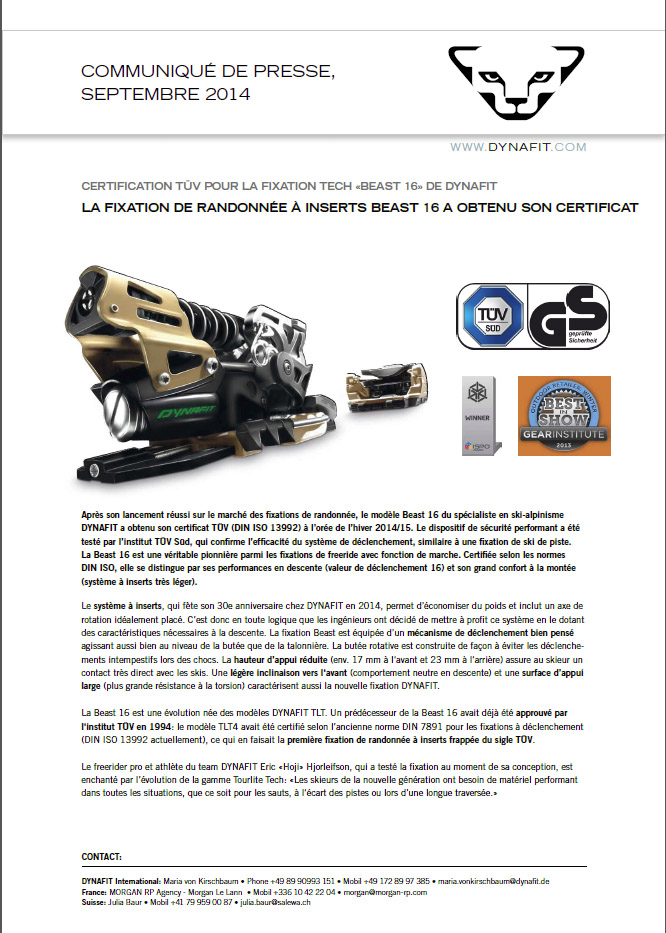 A croire que le segment du ski de randonnée fait tourner la tête des fabricants, car nous assistons à une bataille à distance sur le marché des fixations à inserts. Seulement quelques jours après l’annonce de la sortie de la Marker Kingpin, la première fixation certifiée DIN ISO, Dynafit y est allé d’un communiqué ces derniers jours pour annoncer que sa fixation Beast 16 décroche la norme TüV 13992 garantissant une reproductibilité de déclenchement selon l’échelle de serrage DIN.