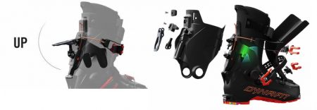 Avec le nouveau modèle Hoji, Dynafit continue de se positionner sur le segment de la freerando. Le concept est intéressant, par l’intermédiaire d’un spoiler mobile, la chaussure se verrouille en mode ski sans avoir besoin de point d’ancrage arrière (contrairement à tout autre système de ski / marche).