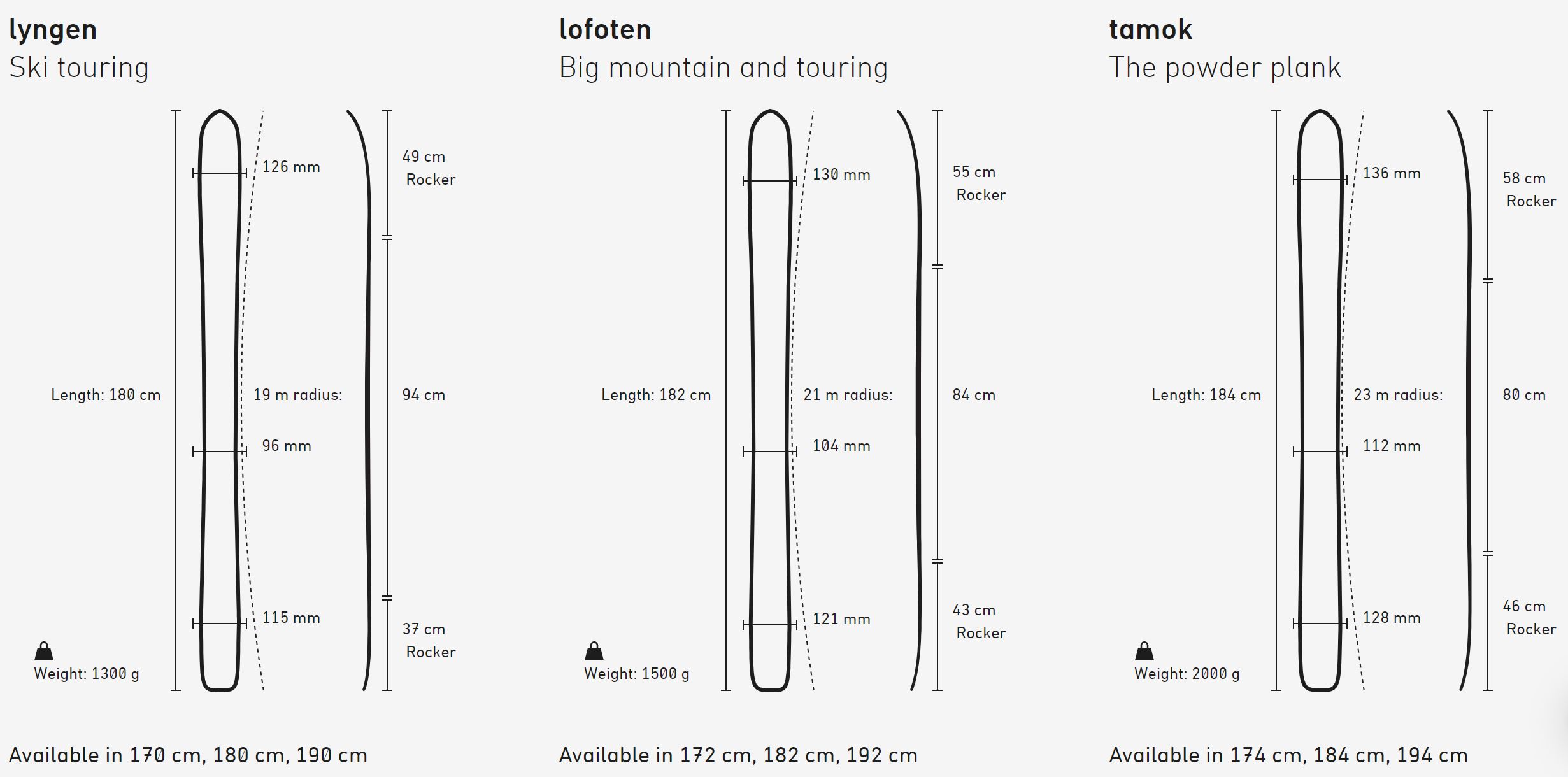 Il s’agira d’une collection très haut de gamme de skis artisanaux en édition limitée et en plusieurs largeurs au patin et dans différentes couleurs, sinon ce n’aurait pas été en ligne avec le style de chez Norrøna toujours très coloré.