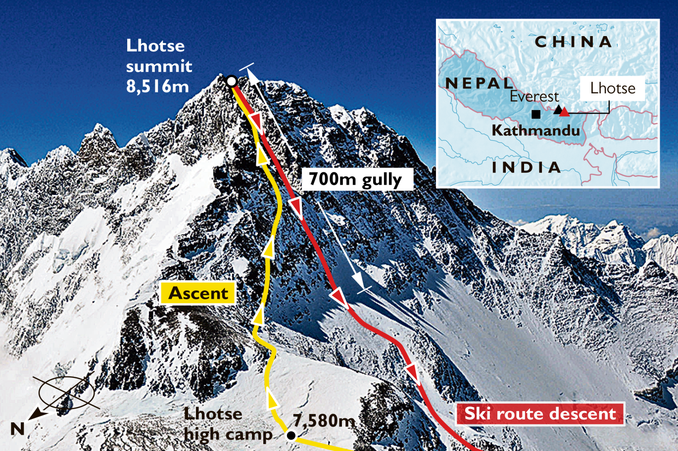 Le quatrième sommet de la planète n’est pas une mince affaire lorsque l’on s’y attaque par sa face ouest comme l’on fait les américains. En effet, c’est un couloir évident mais très raide qui se distingue entre les rochers de la partie supérieure de la face ouest et qui a été skié par les deux américains. Les deux skieurs ont ainsi réalisé une descente de près de 2100 mètres de dénivelés. Les 700 premiers mètres se déroulent dans ce fameux couloir, dénommé la « dream line » du Lhotse, dans lequel aucune erreur n’est permise.
