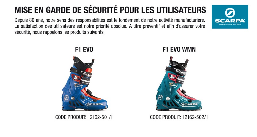 Scarpa rappelle ses chaussures de ski de randonnée F1 EVO et F1 EVO WMN pour raisons de sécurité.