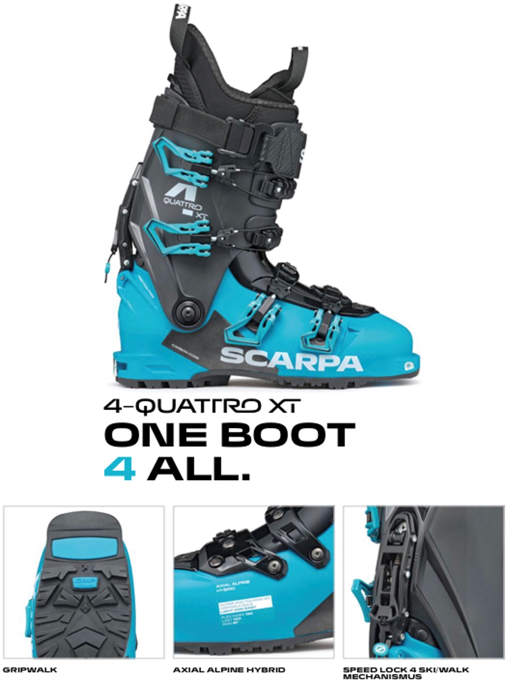 Ces nouvelles chaussures, dénommées « 4-Quattro » sont les premières à se tourner un peu plus vers l’alpin et se veulent être axé sur la performance à la descente. Ces nouveaux modèles seraient, je cite : « Les chaussures de ski hybrides « GripWalk » les plus légères du marché« .