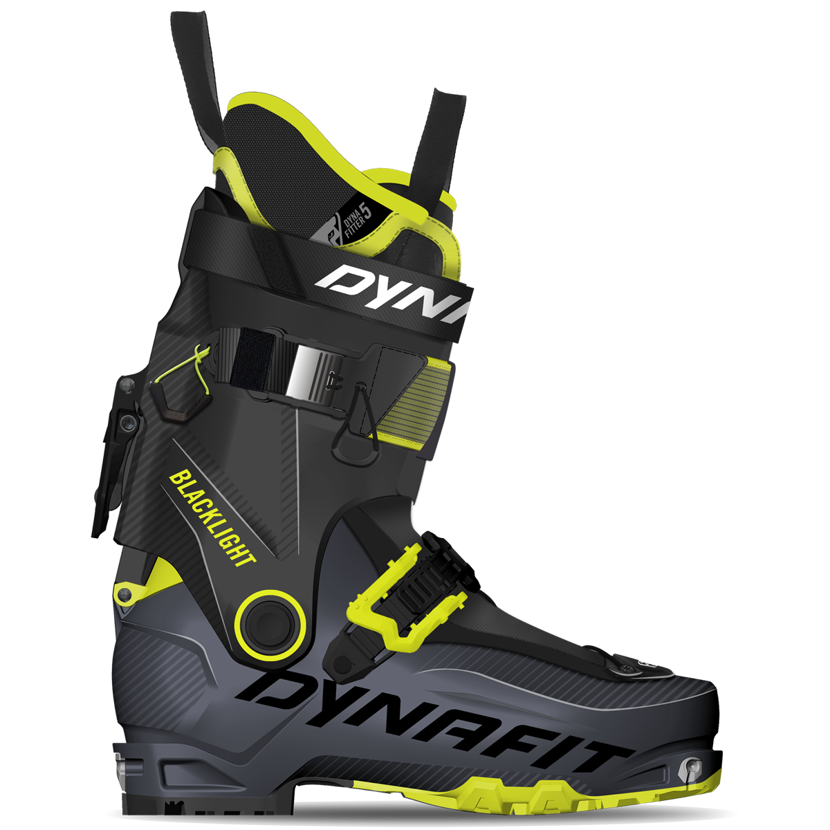 Voilà probablement la pièce maîtresse de la gamme Blacklight. Dynafit frappe fort avec une chaussure qui pèse 1140g, soit à peine plus lourde qu’une vraie chaussure de skimo, mais qui annonce une rigidité de chaussure freeride.