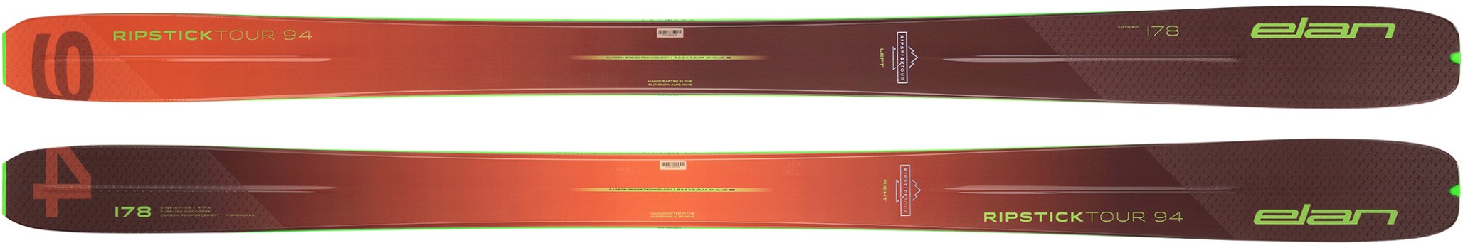 Peu de changement sur le Ripstick Tour 94 de chez Elan qui est conçu sur un châssis large, permettant au skieur de mieux flotter, de skier plus vite et de tourner plus facilement dans des conditions de ski de neige profonde. Elan a cherché une construction pour allier haute performance et faible poids, avec un mélange de performances en descente freeride et de capacité en montée.