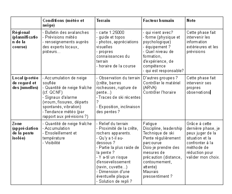 Même si cette méthode peut être parfois contesté par son caractère restrictif si on l’applique à la règle, elle met cependant en avant les principaux points de contrôle que tous skieurs devraient avoir à l’esprit avant de préparer une course en montagne.