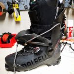 Ensuite, un système de corde Dyneema (une corde couramment utilisée en voile et très résistante) va permettre de serrer le collier haut de la chaussure. Le passage en mode marche/ski est contrôlé par un levier sur l’arrière de la chaussure qui va serrer ou desserrer la corde Dyneema réglable et tire l’ensemble; plutôt astucieux sur ce coup. Cette corde permet de régler le serrage et peut être bloquée sur l’avant avec une pince qui retient le coulissement de la corde.