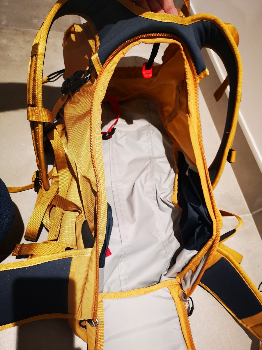 Enfin, ce sac dispose de très nombreux rangements très bien pensés, comme l’illustre parfaitement l’accès intuitif à l’équipement de sécurité en cas d’avalanche ainsi que l’accès à la poche centrale depuis l’arrière.
