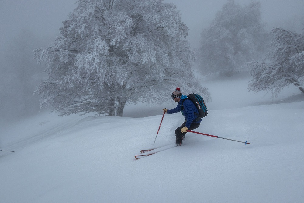 Sur le dur, le ski pivote très bien et se veut rassurant en virage court. J’ai moins été convaincu par son comportement en grandes courbes mais ce n’est selon moi pas là où il s’exprime le mieux et ce n’est pas non plus ce que l’on recherchera forcément en rando.