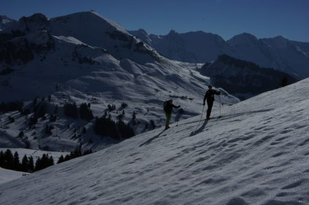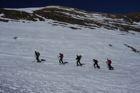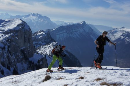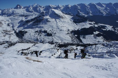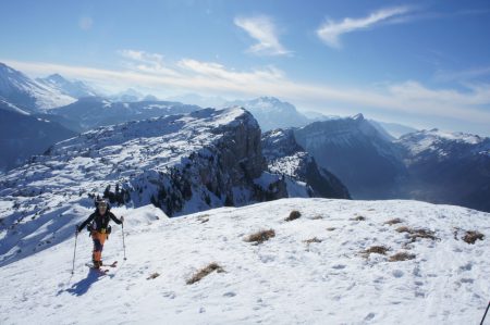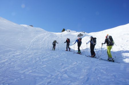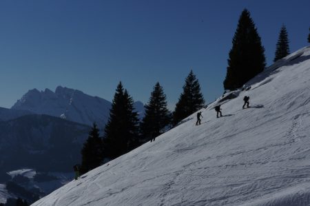 Massif : Bornes – Aravis Description Descente : descendre directement dans la face SE (30° max) afin de retrouver l’itinéraire de montée. Attention aux nombreux rochers qu’il faut bien reconnaître lors de la montée. Pour les éviter, il est possible de partir en traversée pour rejoindre l’itinéraire de montée plus haut un peu en dessous du col (pentes < 30°). Descendre alors par l’itinéraire de montée. Variante de descente plus soutenue : croiser l’itinéraire de montée et passer rive droite du Talweg. Couper au plus court entre sapins éparses et lapiaz pour retrouver un petit couloir étroit (30° max) entre deux barres rocheuses menant au point 1640m, passer à côté d’un chalet puis rejoindre le chemin initial de montée.Attention, le couloir peut être difficile à trouver si ce n’est pas tracé. Accès Journée d’initiation au ski de randonnée pour la section montagne de la boîte, 19 personnes et 4 guides sur le chemin de la petite Aiguille Verte. Beau temps et neige décaillée l’après midi, très bonne ambiance dans le groupe, découverte des conversions, mise en place des couteaux et ski sur neige dure mais parfois un poil décaillée… très bonne journée s’étant terminée par des exercices et explications DVA. Il y a globalement peu de neige dans le massif des Bornes, très surprenant pour l’époque… vivement la prochaine chute de neige. |
