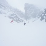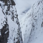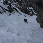 Premier jour et 20 centimètres de neige fraîche pour nous accueillir dans le val d’aoste. Après avoir traîner nos spatules dans les vallons de la Salza et croiser quelques cailloux bien méchants pour nos semelles, nous décidions d’aller en direction du Col Zube pour découvrir le Canyon del Foric et son somptueux couloir donnant accès au vallon d’Olen du côté d’Alagna. Une montée tranquille sous un plafond nuageux dense nous amena au col, duquel nous attaquions la descente vers l’entrée du couloir. Ce couloir est magnifique, un toboggan entre deux falaises et pas mal de pente au départ mais sans grand danger objectif avec la qualité de neige rencontrée ce jour. Les cuisses ont bien chauffé pendant les 400m de descente, mais quelle ambiance ! Un superbe couloir ! |