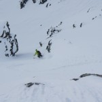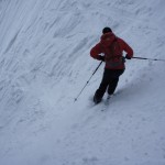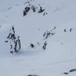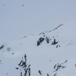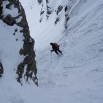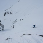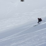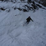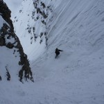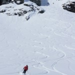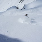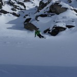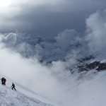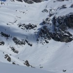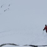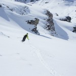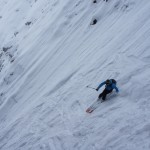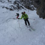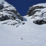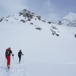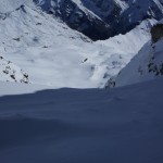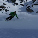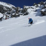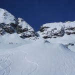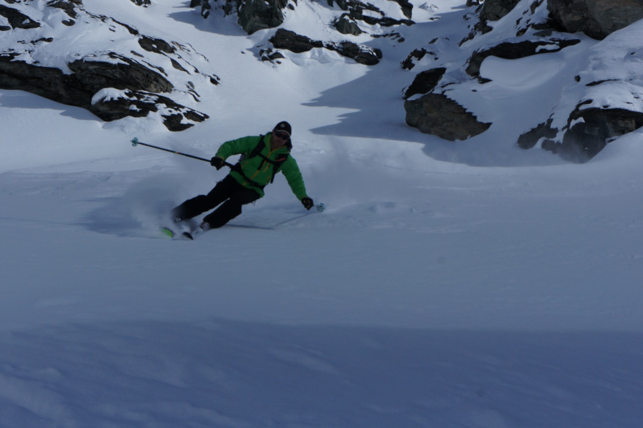 Nous aurons effectué cette descente deux fois, l’une le premier jour pour 5 d’entre nous seulement, avec un ciel bouché au col mais offrant tout de même une bonne visibilité 150 mètres plus bas. Aucunes traces, une pente régulière et 20 cm de neige sur fond dur, un vrai régal. Le lendemain, nous décidons de retourner finir la journée sur la même pente, cette fois-ci avec tout le groupe et avec un immense soleil. La neige était restée froide et légère, encore de la place pour tracer pour tout le groupe et une toujours aussi belle descente. L’arrivée ski au pied au refuge gabiet rend cette descente tout simplement magique. |