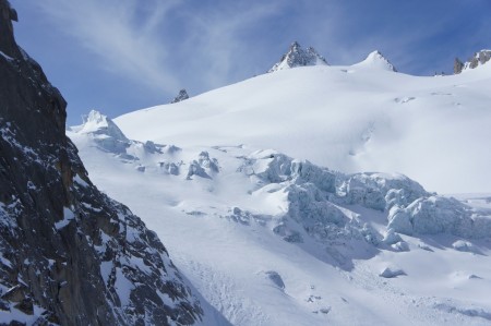 Description Montée Prendre la direction du Relais d’Arpette (possibilité également de suivre la piste de descente de la Breya, mais il faut ensuite redescendre d’environ 50m) pour entrer de plein pied dans le Val d’Arpette; suivre le fond du Val (peu raide) jusqu’à la limite de la végétation où les pentes se redressent un peu. Continuer tout droit en visant le col, visible pratiquement durant toute la course, en contournant le pt 1987m (pied de la tête d’Arpette). Passer au N du pt 2344m pour emprunter un petit goulet à gauche pour éviter la moraine frontale de l’ancien glacier. En cas de danger d’avalanche, prendre l’ancienne moraine de face (raide) et éviter les côtés. Sitôt sur la moraine amorcer un contour sur la gauche, pour bien prendre la Combe des Ecandies sur sa gauche (proche des rochers) et laisser bien à droite les pentes neigeuses de la combe. Descente Par le même itinéraire. L’itinéraire de la descente est bien visible depuis le col. Remarques: – Au départ sans grande difficulté, raidissement marqué dans l’attaque directe de la moraine pour éviter les pentes avoisinantes (dangereuses) ainsi que raidissement de la pente dans la combe des Ecandies. – Exposé par risque d’avalanche. – Le Val d’Arpette orienté NE permet une bonne qualité de la neige en raison du manque total d’ensoleillement en janvier. |