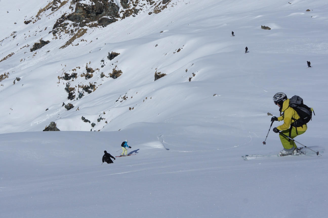 Alors ma connaissance du domaine hors-piste n’est que très limitée, cependant elle s’est encore élargie cette année grâce à l’ami Xavier, avec la découverte du Col supérieur de Bettolina qui donne accès au hors piste de Piani di Verra. Le vallon de la Salza nous a accueilli le dimanche pour deux superbes descentes avec une excellente neige de printemps… merveilleux !
