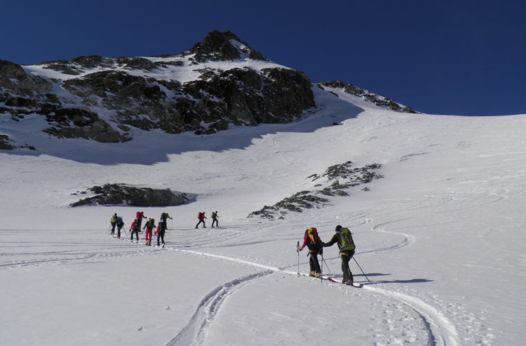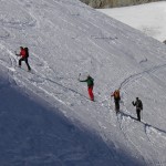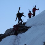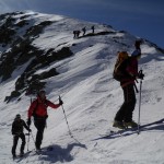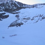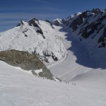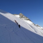 La montée sur le glacier du Mont Tondu s’est faite sur une neige dur mais avec une très bonne trace. L’arrivée au Pain de Sucre était magistrale et la descente dans une neige légèrement revenue fut excellente également. Quel plaisir cette prise de connaissance avec ce coin magique ! |