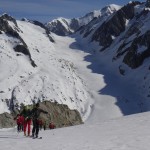| E2 | Nous avons passé la nuit à Tré la Tête et sommes partis le lendemain matin tôt en direction du Tondu. Cette longue et belle course nous a plongée dans l’ambiance des lieux, avec tout au long de la montée une vue superbe sur le glacier de Tré la Tête et les Dômes de Miage que nous allions gravir dès le lendemain.