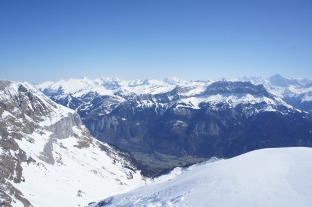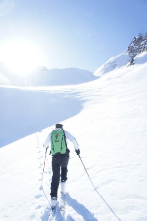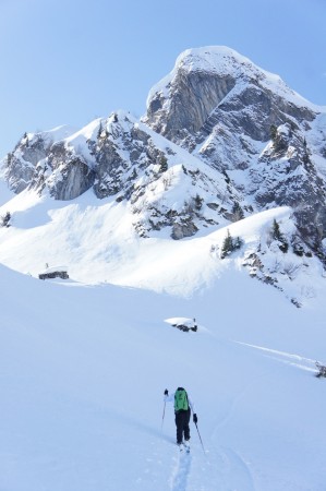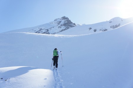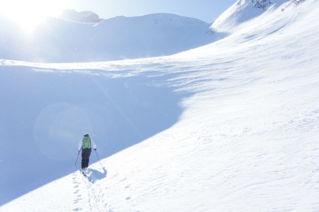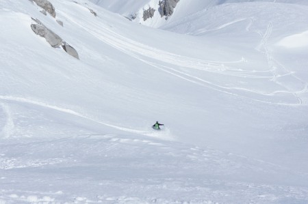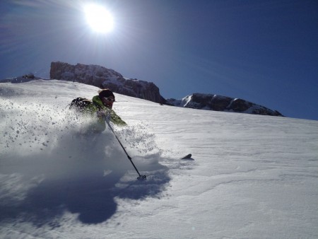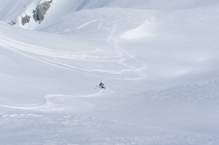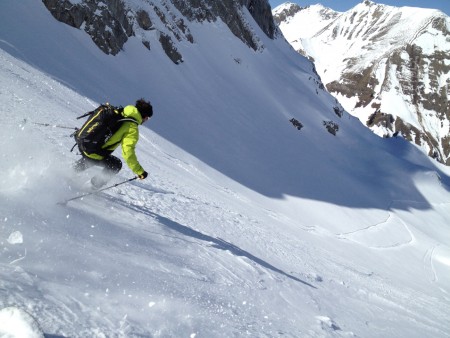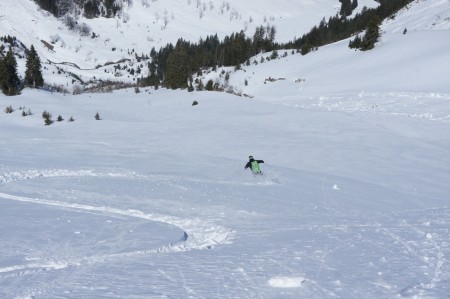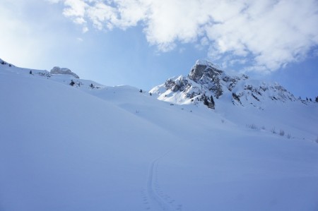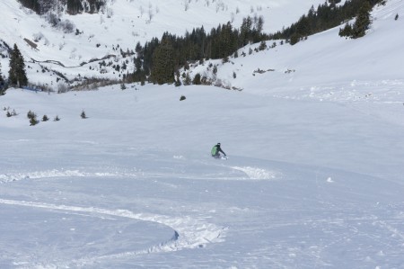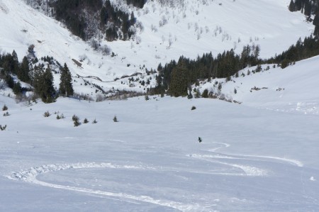Julien et moi avions posé une journée de congé en plein milieu de la semaine, deux jours seulement après une chute de neige et avant le retour des grandes chaleurs. Toutes les conditions étaient réunies pour faire une belle course en montagne, du coté du Reposoir, partie des Aravis que nous ne connaissions pas tous les deux. Du coup nous sommes allés en direction de la pointe de la Carmélite. Le vent de sud-est a pas mal transporté la neige sur le milieu de la combe et nous avons traçé en fonction des accumulations, qui par endroits ne nous inspiraient guère. Bizarrement, plus on se rapprochait du sommet et moins nous trouvions de neige cartonnée. Du sommet nous avons basculé à droite en direction de la combe Marto. La neige n’avait pas été travaillée par le vent sur toute la descente et nous avons eu une poudreuse excellente jusqu’au chalet du bas de la combe Marto. Ensuite la chaleur avait bien ramollie et nous avons poussé / glissé jusqu’à la voiture. Une très belle journée du coté du Reposoir où nous retournerons très certainement. |