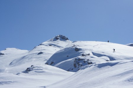 | Difficulté 2.3 | De Vallon rejoindre le Sommier d’Amont, de là remonter en direction du point 1892m, puis suivre une petite combe immédiatement à l’Est de la Pointe de Roulletaz, qui donne accès aux belles pentes Ouest qui mènent à la Pointe de la Carmélite (point 2477m, non nommée sur la carte IGN).Descente : Direction Nord-Ouest, rejoindre la belle combe entre les points 2283m et 2262m, puis retour même itinéraire. | |