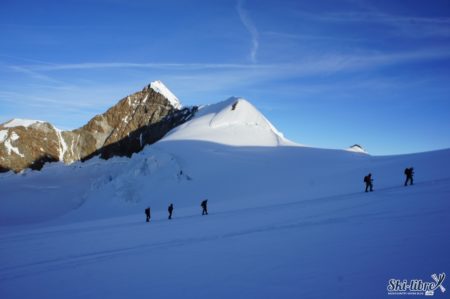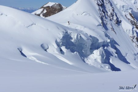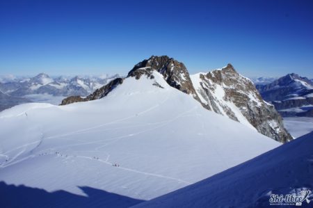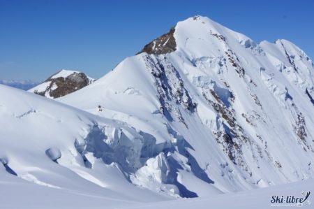 Une seconde journée avec un enchaînement de deux autres sommets à plus de 4000m d’altitude. Toujours d’excellentes conditions de neige sur tout le parcours. La boisson au refuge Margherita à 4454m fut très appréciée du groupe. Un temps parfait nous a permis de profiter du point de vue exceptionnel sur tous les sommets environnants, Lyskam, Pointe Dufour, et tous les 4000 du Mont Rose très accessibles permettant des enchaînement divers et variés. L’ambiance dans le groupe fut une nouvelle fois excellente, avec une bonne forme générale qui nous a tous permis d’enchaîner plusieurs sommets, sans gros effets de l’altitude. Ce massif est vraiment magnifique, l’hiver comme l’été, un coin où il faudra revenir ! |