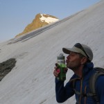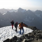 Contourner les crevasses par la droite, en longeant des rochers, puis en reprenant la direction du sommet. On arrive ainsi à la rimaye que l’on franchit par la gauche sous la pente de neige issue du sommet. Pour atteindre le sommet, il reste une dernière pente raide à gravir (environ 35-40°) : selon les conditions, elle peut se faire soit par sa partie neigeuse, au-dessus de la rimaye, soit par l’arête rocheuse Est. Descente Identique à la montée. Il est plus facile de redescendre par la vire de rochers plutôt que par le couloir. |