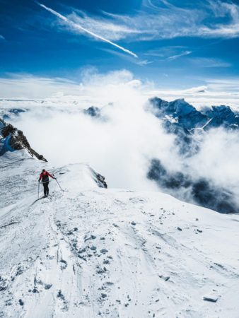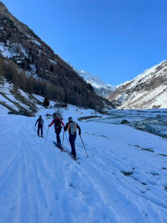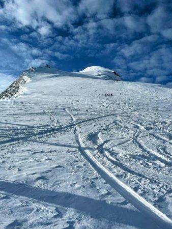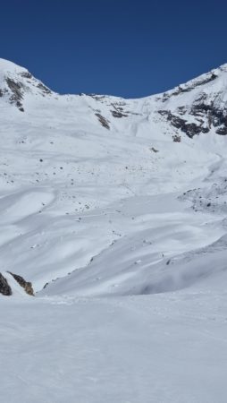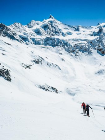 Montée Premier jour : (D+ : 1650m) Ensuite on prend plein nord, pour passer juste au pied du Roc de la Vache. Depuis ce col (2550m env.) on redescend une peu jusqu’au Torrent du Barmé (2550m). Ici il n’est pas obligatoire de poser les peaux, et ça ne vaut pas forcément la peine. Après on remonte au NE jusqu’à la cabane du Tracuit (3258m). Deuxième jour : (D+ : 900m) De là on contourne l’arrête NO qui s’élève jusqu’au sommet. Ensuite on remonte la pente relativement régulière, en passant quand même légèrement sur la gauche vers le haut. En général on pose les skis au pied du sérac juste sous le sommet et monte à pied, mais il est possible de le faire en ski. Par contre la pente est assez raide, et très exposée, si quelqu’un tombe, il fait le grand saut. Descente |
