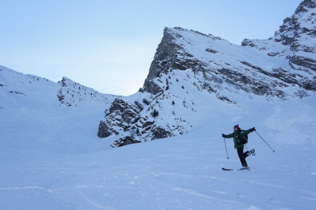 Cette combe garde souvent la neige très froide et nous pensions y trouver des bonnes conditions, ce qui a été le cas pour la pente sommitale qui était encore toute poudreuse.