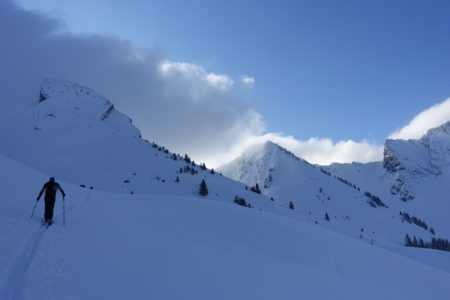 Départ de la route au dessus de la Savatte ou depuis les Fontanettes, voire de la Savatte même en cas de bon enneigement. Rejoindre par de larges trouées forestières les chalets des Fontanettes, puis ceux des Hauts de Marlens, se diriger vers la combe W du Charvin, puis remonter la combe jusqu’ au col des Porthets. Descente idem ou par la combe des Fours en basculant au N de la croupe 1969 (plus intéressant). Remarques : possibilité de faire plusieurs combinaisons. |
