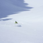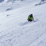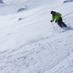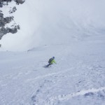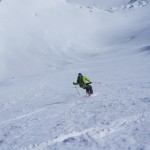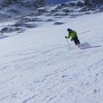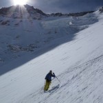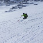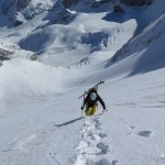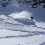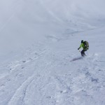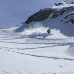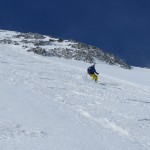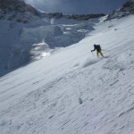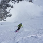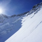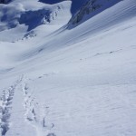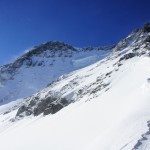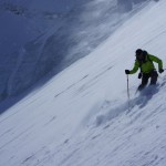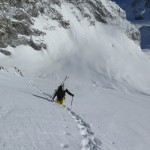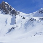 Bien nous en a pris car nous sommes montés à Félix Faure juste avant le passage d’une perturbation dans la nuit de mercredi à jeudi avec un bon refroidissement, certes temporaire mais dans le parfait timing pour notre virée. Nous avons donc entamé la montée, Xavier m’a fait une trace majestueuse, les conditions étaient excellentes dans la face. Cependant cela ventilait pas mal au sommet sur l’arête et nous redoutions les transports de neige. Bien nous a pris d’être attentif, dans les 20 derniers mètres une petite plaque à vent s’est déclenchée alors que Xavier « châlait » sur les derniers mètres. Arrêt immédiat et logique, juste à portée de main de la sortie.Nous avons donc chaussé en plein dans la pente, une belle petite plateforme pour nous préparer et ensuite… juste magique, du grand ski, une neige douce excellente, accrocheuse et un peu poudreuse sur 10cm tout au long de cette très belle pente. La suite derrière le col fut en poudreuse aussi jusqu’au sommet des remontées de Pralognan, pour nous permettre de redescendre jusqu’en bas au village ski aux pieds. |