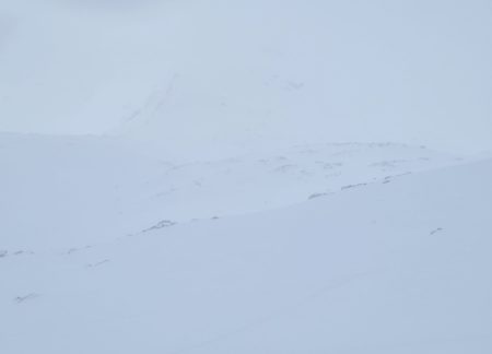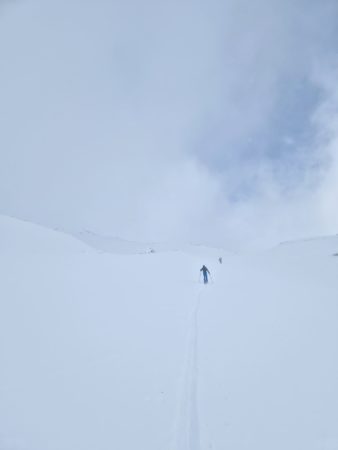 Comme la veille le plafond nuageux est bas mais nous avons une meilleure visibilité pour monter presque au sommet. Nous nous sommes arrêtés 100m sous le sommet en raison du jour blanc qui nous empêchait de voir la sortie au sommet.