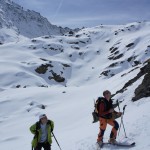 | 450m | Secteur : Valais Description Les 50 derniers mètres forment un goulet qui peut devoir être remonté à pied (env. 40° au max). Du col, on peut monter au sommet de la Cassorte rapidement à pied. Variante montée Descente Le « vrai » col des Ignes est un peu plus loin au Nord Ouest en suivant la crête qui mène aux Aiguilles Rouges. On peut le rejoindre à ski en contournant les rochers sur le versant du Val des Dix (courte remontée). Du Col supérieur des Ignes, prendre directement la grande pente en versant N: env. 200 m à 40° au début. On rejoint la voie « normale » du col des Ignes par la Gouille. Au lieu de descendre au fond du vallon des Ignes, on peut tirer à droite, depuis env. 2700 m, vers Pra Gra. On peut ainsi rejoindre directement Arolla. Ou encore mieux: lorsqu’on suit le chemin d’été descendant vers Pra-Gra (depuis la Cabane des Aiguilles Rouges), descendre une belle pente plein N sous la crête qui descend de la Roussette à la Tête du Tronc. Au bas de cette pente, ne pas s’engager dans le couloir qui lui fait suite (cascade de glace !), mais tirer à gauche quelques dizaines de m pour prendre un petit couloir parallèle. On rejoint alors le fond du vallon des Ignes, et la voie « normale ». Variante descente |