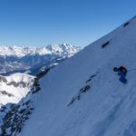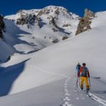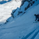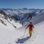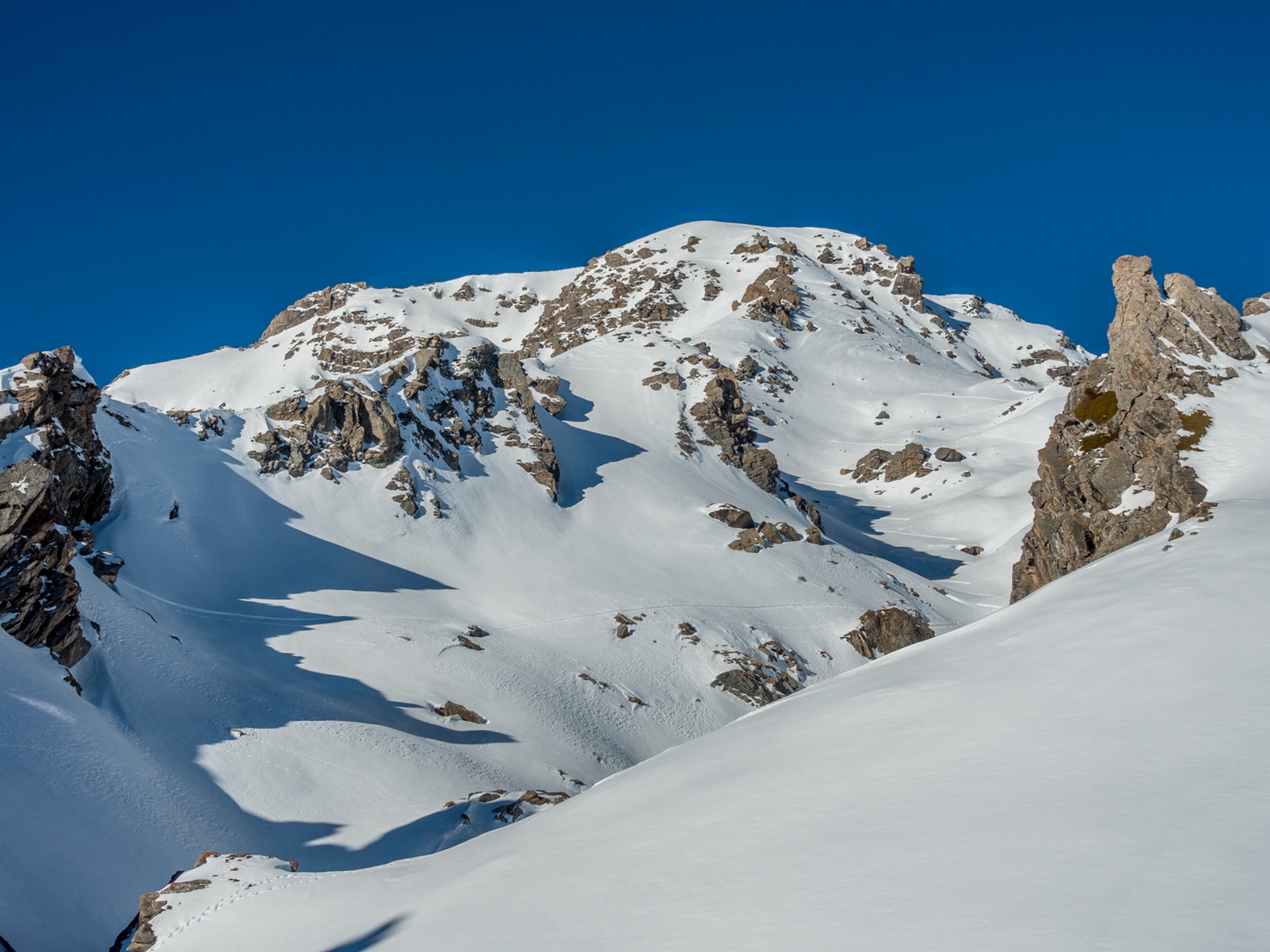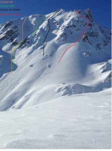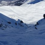 Nous n’avons pas été déçu, c’est long, sauvage, il y a peu de monde et le coin est superbe. La montée par cette combe est très esthétique et offre un caractère alpin intéressant. Attention tout de même de ne pas y aller lorsque les pentes sont trop chargées. Une fois au sommet les différents couloirs sont évidents et donnent envie d’y engager les spatules. Nous avons choisi le couloir Nord Est car il était moins skié par rapport au couloir ENE. Bon choix avec une neige excellente jusqu’au pied.