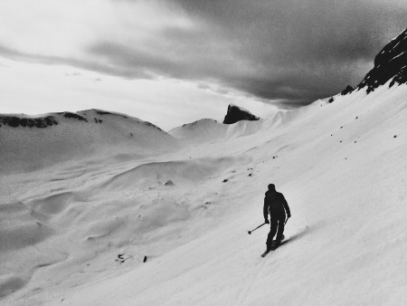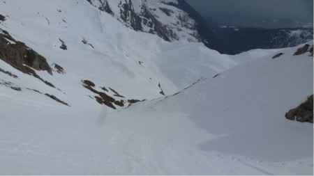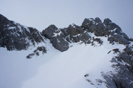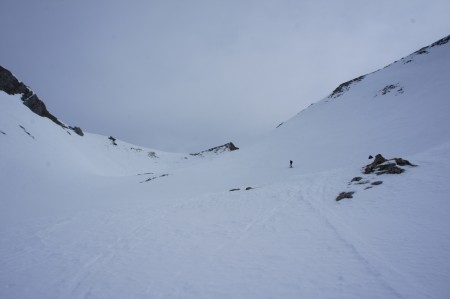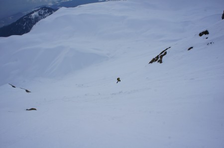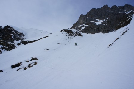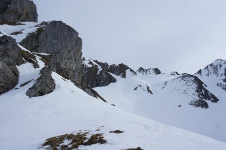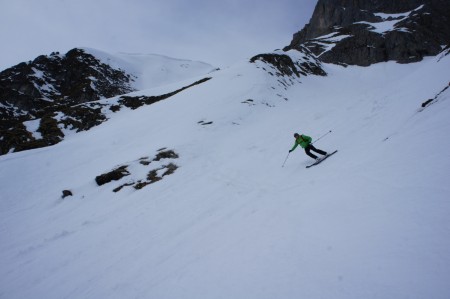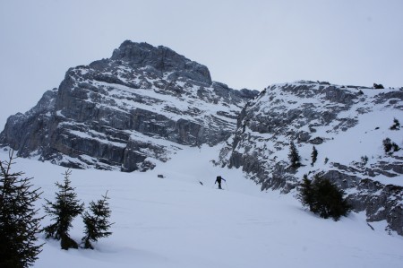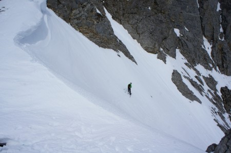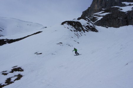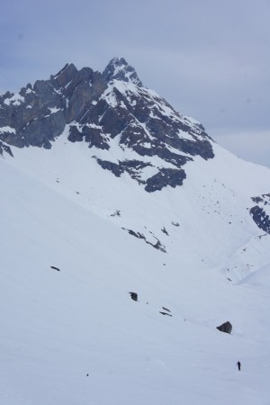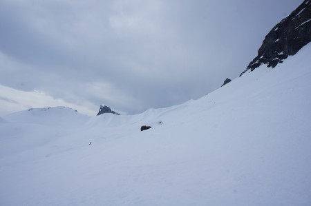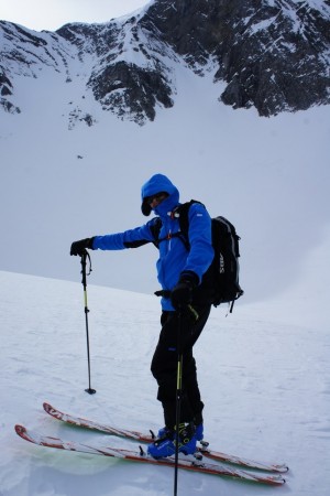 Cela faisait 4 ans que mon ami François de montagnesdannecy.com souhaitait faire ce tour. Malheureusement nous n’avons pas eu droit à de très bonnes conditions, la faute à un soleil qui est resté caché par les nuages une bonne partie de la journée. Heureusement pour nous, le soleil est réapparu alors que nous étions au milieu de la combe du Charvet ce qui a très légèrement chauffé le couloir Est. Résultat, nous n’avons pas eu droit à une neige béton, mais une neige très légèrement décaillée avec un excellent grip. Arrivés en bas du couloir, le soleil s’était de nouveau caché… Bref, très bon timing avec un soleil très joueur…