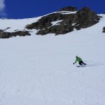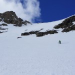 Descente: Redescendre sur l’arête NE jusque vers 2650m et plonger dans une combe NE qui permet de rejoindre la trace de montée. directement le replat de mi montée. À la hauteur des pentes orientales de Punta Bessie continuer par un couloir N quipermet de rejoindre la vallée. La pente devient plus raide et se divise en deux branches, prendre de préférence celle de gauche (nord) plus abordable (environ 100 mètres à 45°, bien visibles lors de la remontée) qui se dirige au fond de la vallée, rejoignant le chemin de montée. |