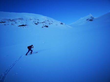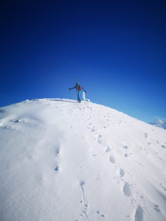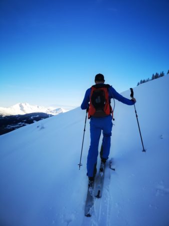 Nous avons mis les skis sur le sac pour les 100 derniers mètres car la trace devenait difficile, sur une neige fuyante sous les skis.