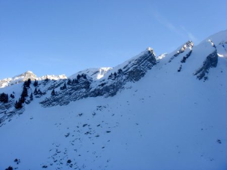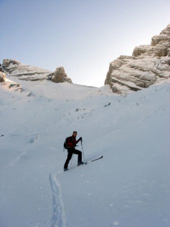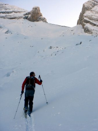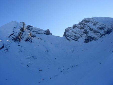 Depuis le départ des bennes, rejoindre la combe du Fernuy (combe très caractéristiques sous les télécabines). Lorsque la station est ouverte, cette combe est en fait une piste que l’on rejoint facilement. Remonter la combe, puis vers 1750m tirer à gauche afin de rejoindre une brèche et ainsi le bas de la combe de la Creuse. Arrivé au bas de la Creuse, la Porte des Aravis est le col très caractéritique entre deux falaises. On y monte rive gauche. ** La légende raconte que lors de sa traversée des Alpes, Gargantua trébucha sur la chaîne des Aravis. Énervé, il donna un grand coup de pied dans la montagne. La Porte des Aravis était née. Le pic rocheux qui s’en détacha atterrit alors dans le massif du Beaufortain : la Pierra Menta était née… ** Descente Même itinéraire qu’à la montée. Remarques Il est préférable de faire cette course en début/fin de saison lorsque la station de la Clusaz n’est pas encore ouverte. Cependant, lorsque la station est ouverte la combe du Fernuy est une piste, certes pentue, mais facile à remonter car damée. Pour éviter de croiser des skieurs, il est conseiller d’arriver au moment de la bifurcation à 1750m vers 9h30. |