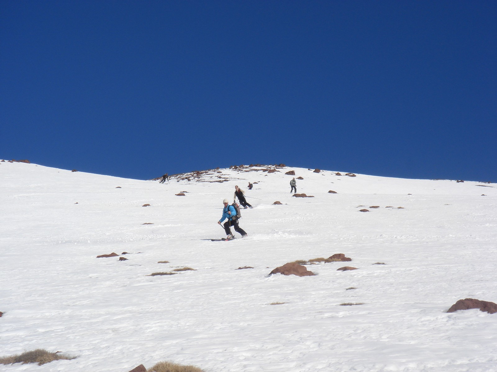 C’est le grand jour ! Réveil 6h30 pour un départ dans une grande fraîcheur une heure plus tard, direction le plus haut sommet d’Afrique du Nord. Les premières pentes nous ont tout de suite donné le ton de la journée, neige dure, voire glacée et beaucoup de roches aux alentours… autant dire qu’il n’y avait pas beaucoup de neige sur le Toubkal en ce mois de janvier, moins que dans la vallée précédente en tout cas.
