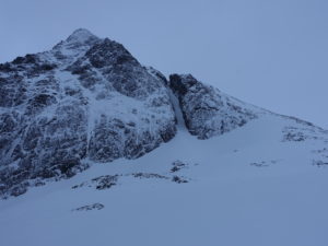Ce couloir est hyper beau, très visible de loin. La marche d’approche est un peu longue pour atteindre son pied. Le couloir fait 400m de long et peut se remonter entièrement en peaux mais se fait également en crampons. Du sommet la vue est magnifique sur les Steinfjord et Ersfjord.