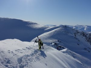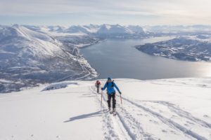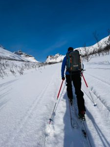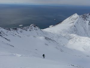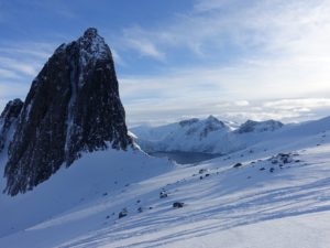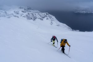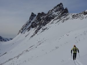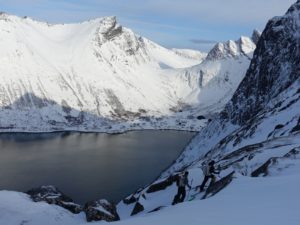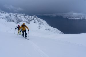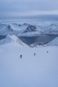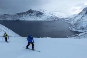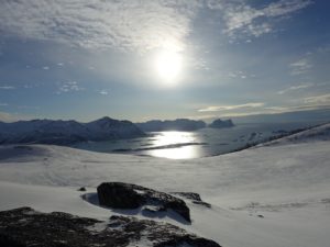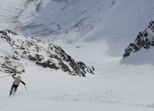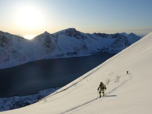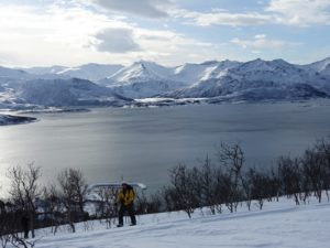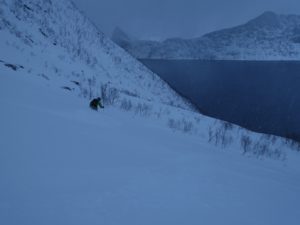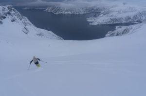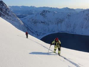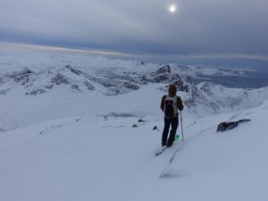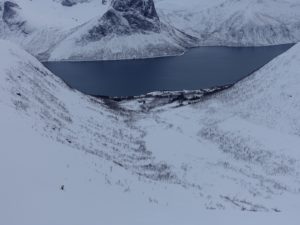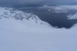 La descente est fantastique, le couloir est super skiant, il permet de lâcher les skis et de prendre un peu de vitesse. Une fois le bas du couloir atteint, nous décidons de repeauter pour aller en direction du Snaufjellet, sommet qui s’atteint par un col évident et qui offre une vue magnifique sur le Bergsfjorden.
