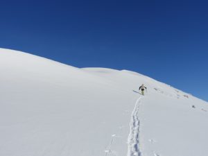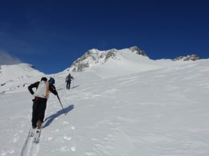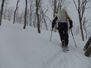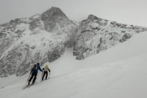 Arrivée au pied de la combe menant au col, nous décidons de profiter d’une descente en poudreuse pour remonter lorsque le temps s’améliorera. Nous dépeautons et engageons une descente féérique entre les bouleaux de cette combe. Nous revenons au point de départ et soudainement le ciel s’ouvre. Notre journée de beau temps va commencer.