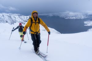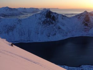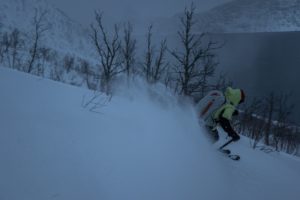 Après ces quelques minutes contemplatives nous longeons la crête pour aller skier quelques lignes au dessus du village, nous offrant encore une excellente neige et une lumière à couper le souffle sur le fjord.