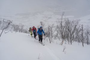 A 14h et après un bon repas, nous décidons de nous rendre du côté de la classique du Store Hesten, afin de bénéficier du ski dans les bouleaux et de pouvoir profiter d’une potentielle éclaircie. Julien avait également en tête de skier le superbe couloir nord du Store Hesten. Cependant une fois arrivé au pied, nous nous rendons vite compte que le vent à charger le couloir et que des tourbillons de neige se déversent dedans avec les rafales. Nous restons prudents et continuons sur l’itinéraire classique, toujours sous la neige.