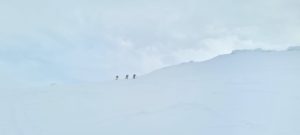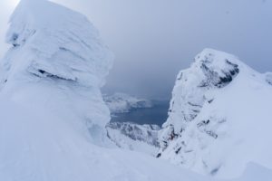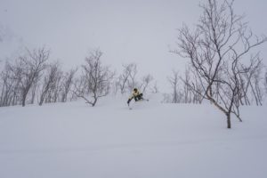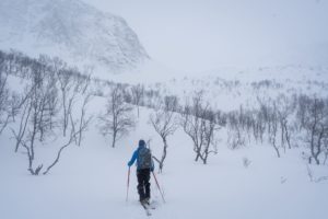 La météo nous annonce le retour du beau temps pour notre cinquième jour. Nous décidons d’aller en direction du Roalden et du Burstinden au dessus de Senjahopen. Deux classiques qui peuvent s’enchainer à la journée. Nous remontons la combe nord dans une neige très froide et sous une neige très dense. La météo se serait-elle trompée ?