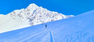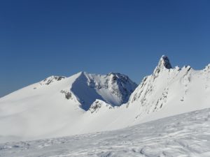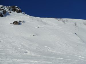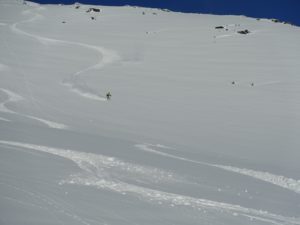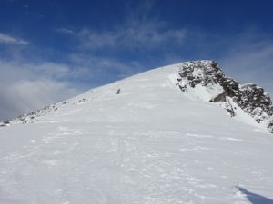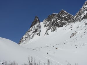 Nous remontons la combe puis rejoignons le pied du Roalden. Une pente à 30° permet de rejoindre une longue crête permettant de rejoindre le sommet. Celle-ci nous paraît très chargée et ne nous invite pas à la rejoindre. Nous discutons, nous observons le Burstinden, le risque sera-t-il le même ? Le vent a-t-il plaqué la face de la même manière. Nous constatons que l’épaule pour remonter au Burstinden a été moins venté avec beaucoup moins de dépot de neige dans la face.