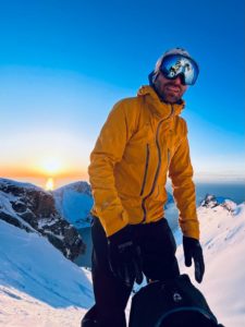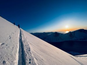 15h45, nous avons déjà 1100m dans les jambes, nous repeautons pour remonter cette face. Notre objectif était d’arriver avant 17h15 pour skier au soleil couchant. 17h au sommet, nous prenons le temps de quelques photos depuis le sommet et nous engageons nos virages dans une neige de cinéma sur près de 750m. La pente est parfaite, la lumière est rasante tirant sur le jaune, le moment est suspendu.