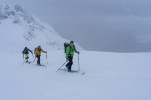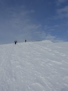 Anthony propose d’aller du côté du Stormea, sommet plus alpin avec un parcours d’arête pour atteindre le sommet. Depuis le col, c’est ski sur le dos que Julien, Ben et Anthony rejoingnent le sommet après une heure de portage et traçage dans beaucoup de neige sur une arête effilée. Ils ne pourrons skier depuis le sommet mais glisserons à mi-pente le long de l’arête pour rejoindre le col.