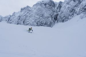 Deuxième journée de notre périple. Il a neigé 10cm dans la nuit et le temps nous offre un grand ciel bleu au réveil. Comme nous ne savons pas comment le temps va évoluer au cours de la semaine, nous décidons d’aller skier le très esthétique Luttinden couloir que nous avions repéré lors de nos préparatifs.