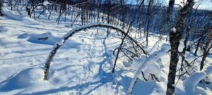 Une éclaircie apparaît alors que nous sommes non loin du sommet. Nous ne l’avons cependant pas rejoint car il commençait à se faire tard mais aussi car un gros grain revenait sur nous à toute vitesse. La redescente se déroule dans une neige froide et profonde dans la forêt, un vrai régal, mais dans un temps typiquement norvégien.