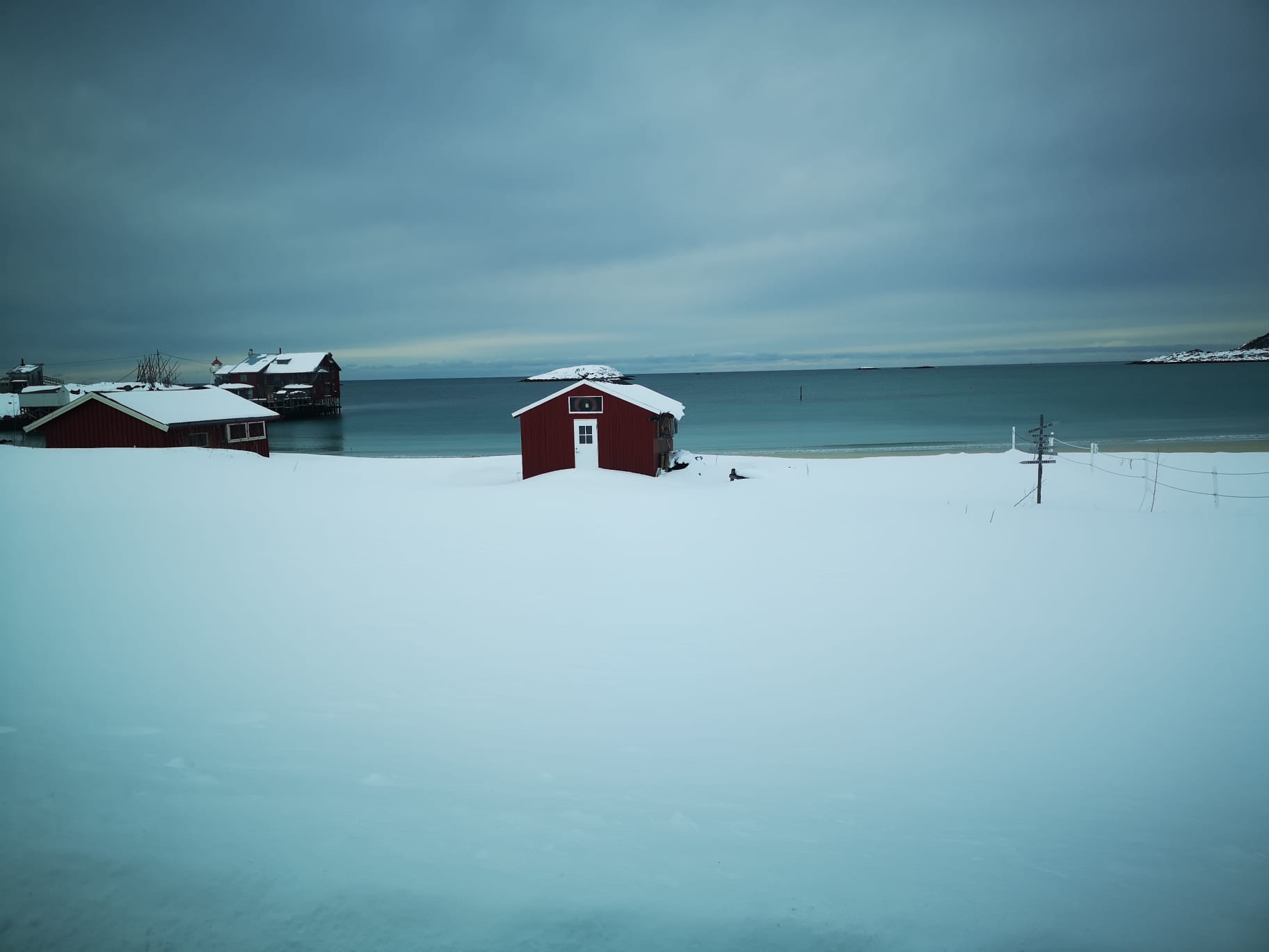 Au réveil de notre quatrième jour, le vent tape très fort contre les fenêtres du Rorbu à Bøvær et il neige à l’horizontal. La météo annonçait une belle dépression pour une grosse journée et du coup nous sommes restés au lit un peu plus longtemps car le temps n’invitait pas à mettre le nez dehors immédiatement.