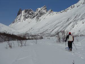 Depuis la sortie du tunnel Skalandtunellen où l’on peut garer les véhicules, prendre une combe qui mène par l’Ouest à un col évident au pied du Stormea et du Tverrfjellet qui est la classique qui se fait en boucle par le même départ. Du col, remonter l’arrête en crampons – piolet pour rejoindre le sommet du Stormea. Descente par la pente sommitale possible si les conditions nivologiques le permettent (pente 40°). Depuis le col, possibilité de remonter le Litjemoa pour rallonger la journée. Redescente en Sud au dessus du tunnel. |